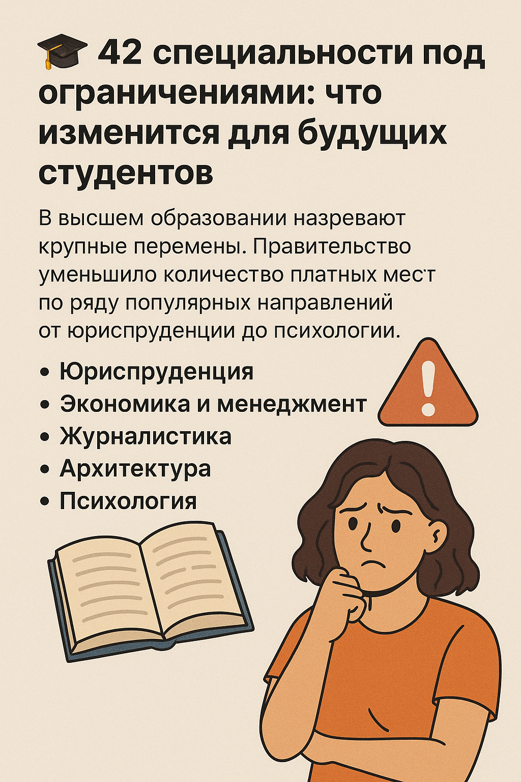 В высшем образовании назревают крупные перемены. Правительство утвердило список из 42 направлений, по которым уже со следующего учебного года сократят количество платных мест. Решение коснётся самых популярных сфер — от юриспруденции до психологии — и способно заметно изменить расстановку сил на рынке образования.