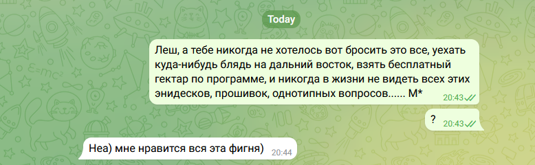 К чему это все я. Прямо сейчас, в абсолютно нерабочее время, в рамках личного разговора, ибо уже подружиться успели за годы работы... В общем, происходит такой диалог:
