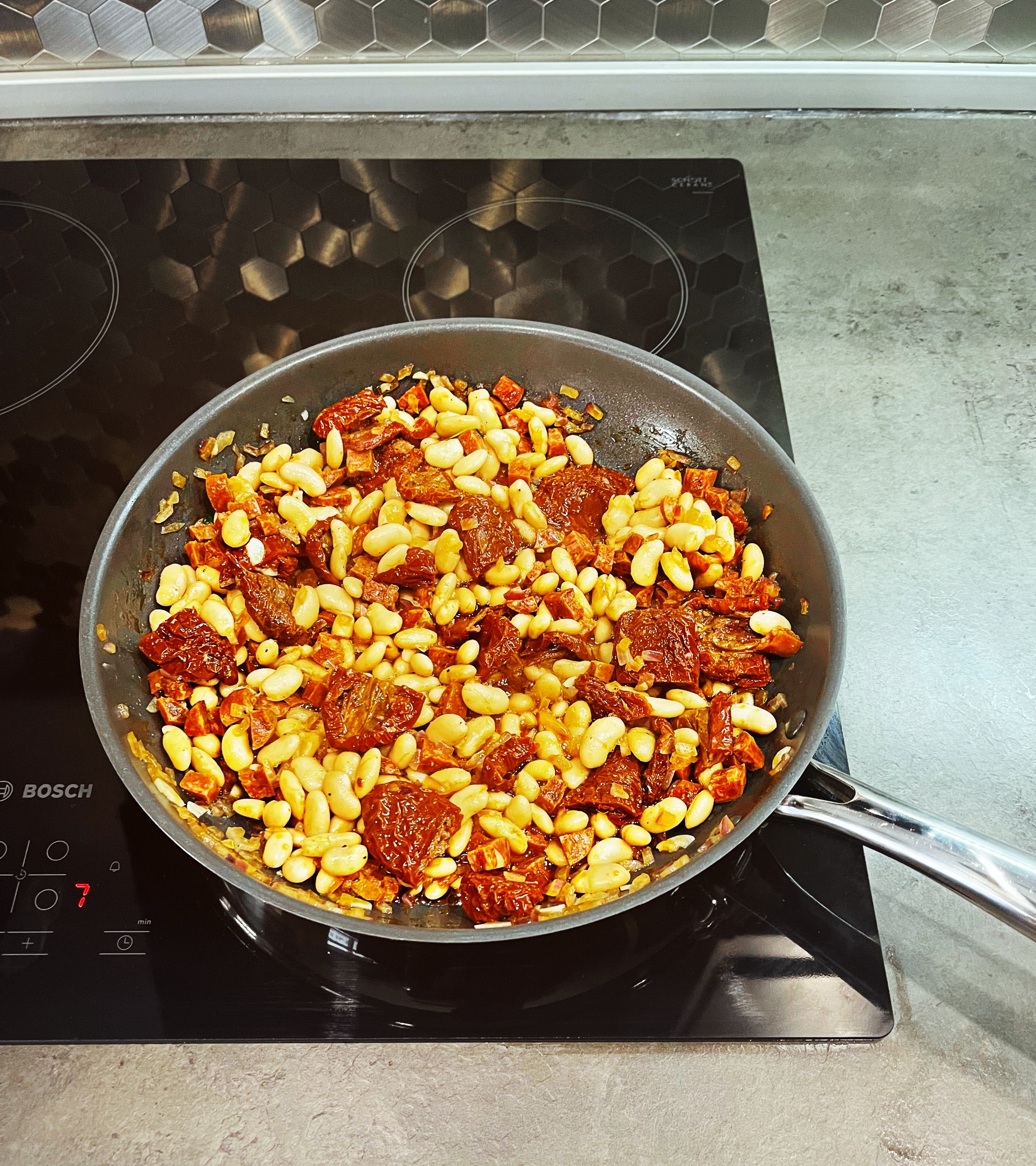 Добавляем фасоль, перчим, солим и дав прогреться пару минут добавляем вяленые томаты ( по рецепту их резать не нужно, но я позволил себе все таки пополовинить их). Чуть не забыл - добавляем пару ложек масла из под этих самых томатов. Перемешиваем, выключаем огонь и возвращаемся к чилящей в стороне курице.