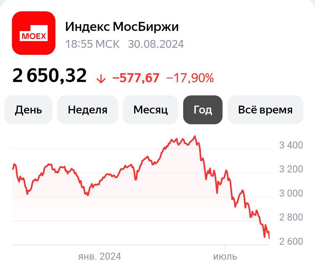 Последний торговый день лета подошёл к концу. Индекс мосбиржи продолжает планомерно снижаться и достиг, на момент написания публикации, 2650п.