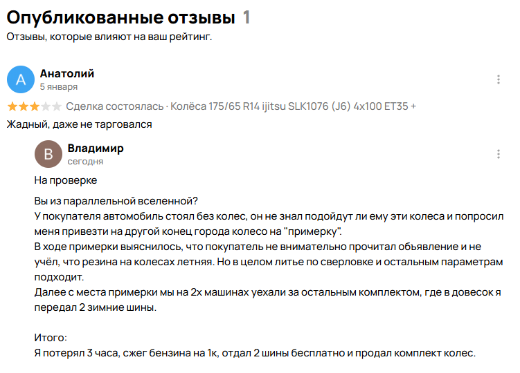 По приезду в гараж, он начал осматривать литье с фразочками по типу "колото", "резина не с салона"-однако на фотографиях крупным планом эти моменты указаны и даже в тексте прописаны, по результатам осмотра поступило предложение отдать за 15, а стоял комплект за 21. Желание было накинуть до 25, но сдержался. После его отзыва жалею, что не "торганулся вверх", даже если бы он отказался я ничего не потерял кроме времени и бензина, с продажей не спешил, хотел выручить человека, а оказалось, что я жлоб.