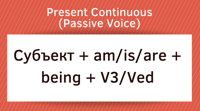 При образовании времён группы Continuous в страдательном залоге нам как раз необходим наш being. Возьмём для примера настоящее продолженное время (то есть действие совершается в данный момент или период времени). Строение будет выглядеть так: