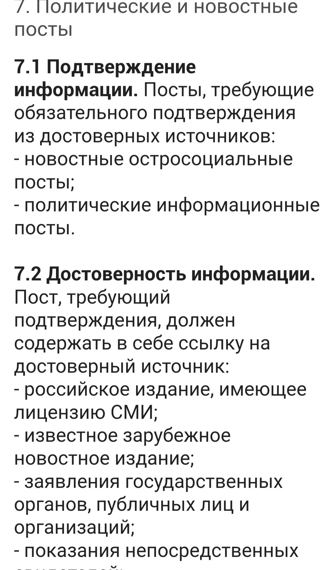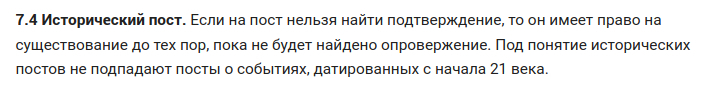 7.4 Исторический пост. Если на пост нельзя найти подтверждение, то он имеет право на существование до тех пор, пока не будет найдено опровержение. Под понятие исторических постов не подпадают посты о событиях, датированных с начала 21 века.