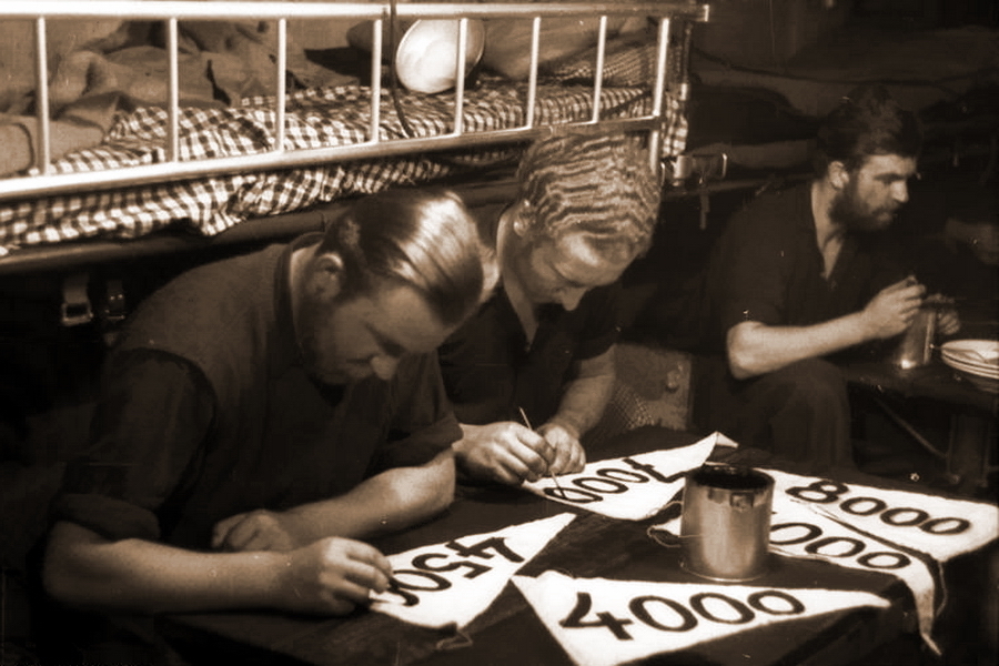 Моряки экипажа U 132 за приятной работой — рисованием победных вымпелов по возвращении на базу, август 1942 года