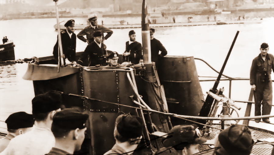 Подлодка U 68 возвращается на базу. В белой фуражке — командир лодки корветтен-капитан Карл-Фридрих Мертен