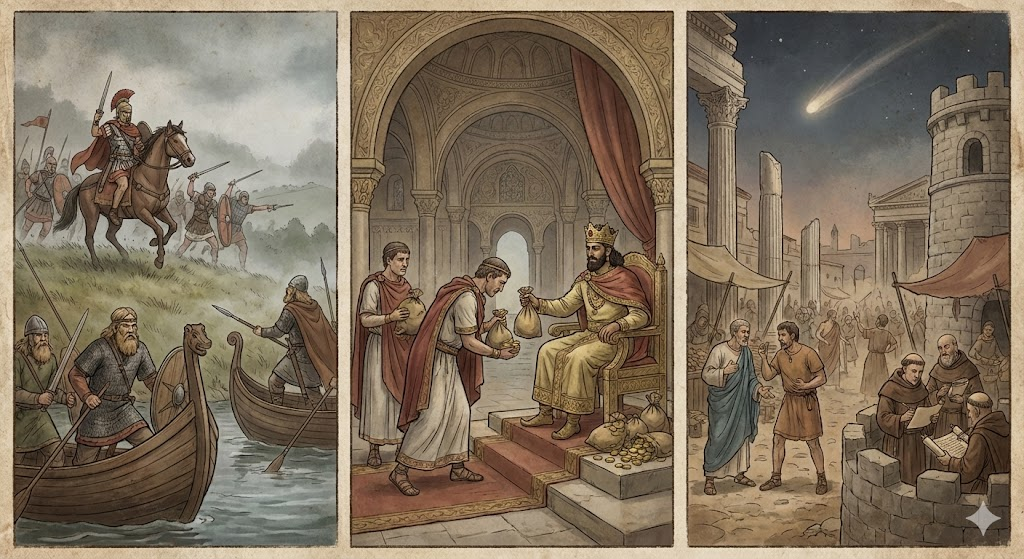 Примерно в эти годы (даты плавают, ибо летописцы тогда были так себе) происходит легендарная Битва при горе Бадон. Суть: Бритты (местные кельты + остатки римлян) поняли, что саксы (понаехавшие германцы) их совсем зажали. Они собрались в кучу под знаменами некоего военачальника. Интрига: Именно этого военачальника позже назовут Королем Артуром. Был ли он королем? Вряд ли. Был ли у него Мерлин? Точно нет. Но саксам наваляли так знатно, что их экспансия на запад острова остановилась лет на 40. Бритты выдохнули и пошли дальше пить эль.