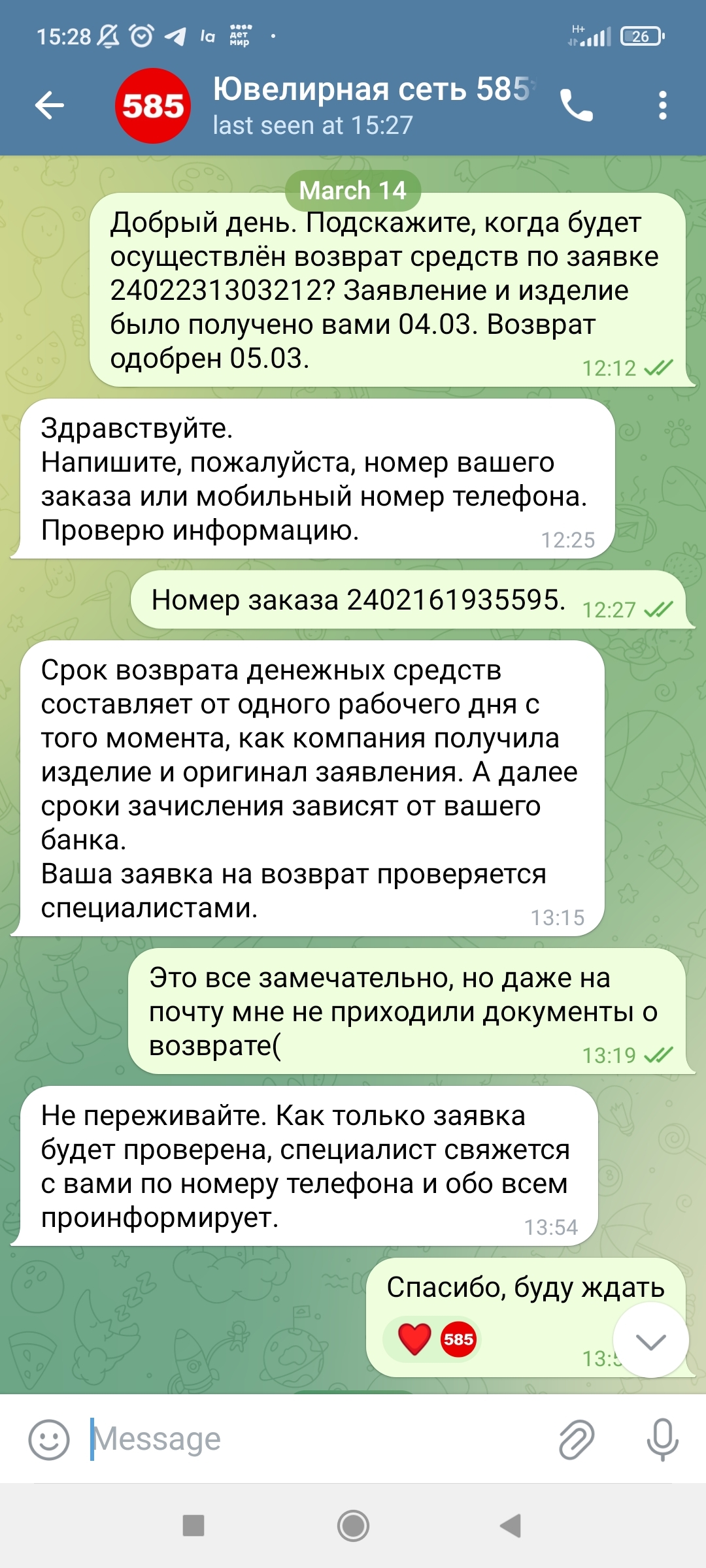 5 марта возврат одобрен продавцом. На основании ст 26.1. Закона о защите прав потребителей, при отказе потребителя от товара продавец должен возвратить ему денежную сумму, уплаченную потребителем по договору, не позднее чем через десять дней со дня предъявления потребителем соответствующего требования. 13 марта истекли все возможные сроки по возврату средств. Сегодня 8 апреля, денег до сих пор нет. На все свои обращения в сеть 585 Золотой я слышу только одни отписки.... То техническая ошибка, то ещё что-то. Доказательств реальности этой технической ошибки приведено не было.