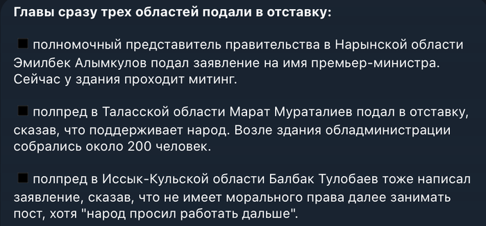 «Я вышел к митингующим, выразил готовность работать с народом. Митингующие поддержали меня, сказали, что пока в Бишкеке все не прояснится, наша задача — обеспечить порядок и стабильность в регионе», — сказал он.