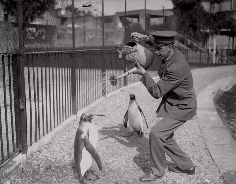 Работник зоопарка устраивает пингвину «душ», поливая его из лейки, 1930 год.