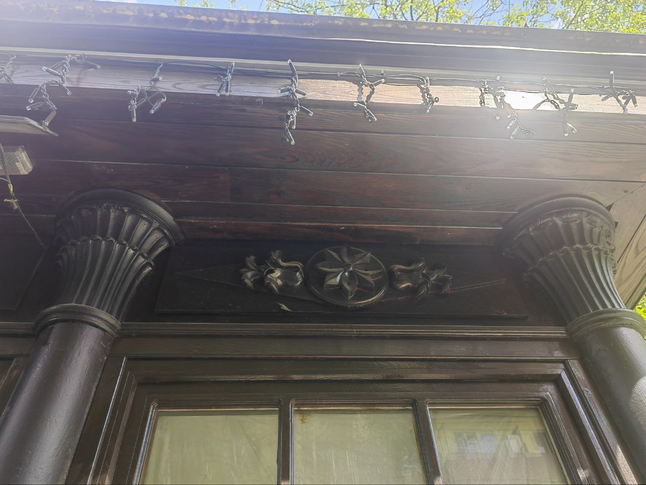 Цветочек наверху - это резное деревянное панно. Навершия колонн - капители, отлитые по образцу детали, сохранившейся во внутренней части павильона. Фото автора.