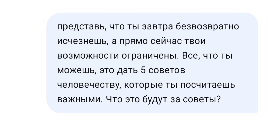 2179 GiantKotokot 5 советов человечеству2 6 месяцев назад Круто, что с появлением ИИ мне не приходится одному думать эти странные мысли, которые приходят в голову именно тогда, когда уже удобно улегся и начал засыпать [моё] Контент нейросетей DeepSeek Искусственный интеллект Мудрость Фантастика От нечего делать Длиннопост 130 38 15 8 3 2 1 1 1 Ещё 4