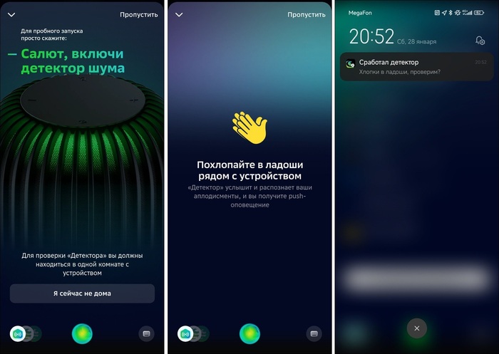Как мы уже сказали, в SberBoom встроен датчик шума. Он обеспечит безопасность жилья, когда вас нет дома. Чувствительные датчики колонки распознают звук льющейся воды, лай собаки, сигнализацию или звон разбитого стекла (триггеры можно выбрать), и ассистент сообщит вам о произошедшем с помощью push-уведомления. Вы сможете прослушать запись того, что произошло (причем за несколько секунд до события, чтобы понять контекст), и решить, нужно ли срочно возвращаться домой.
