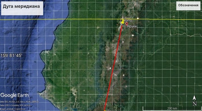 Есть кусочек дуги меридиана, который начинается где-то в районе экватора. И его длину необходимо измерить. Это примерно между Кито и Куэнкой (городами в современном Эквадоре).