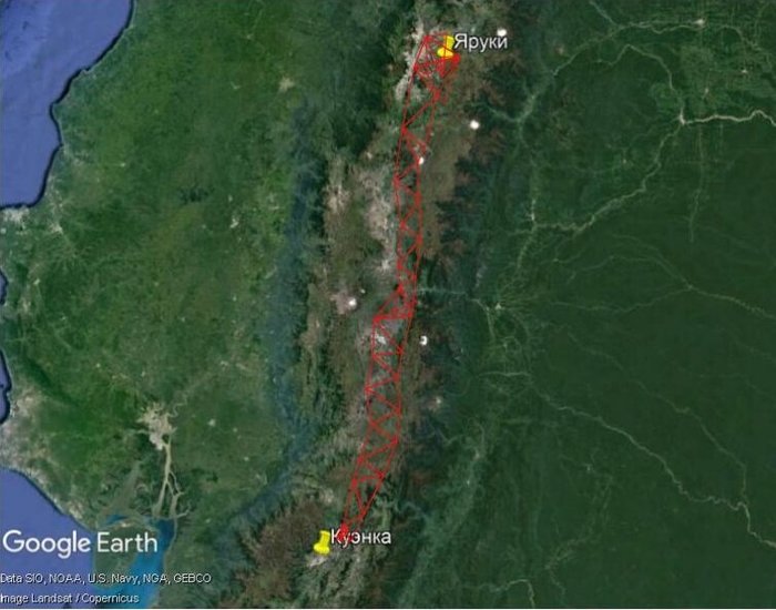 На современную карту тут наложены треугольники перуанской экспедиции (примерный экскиз)