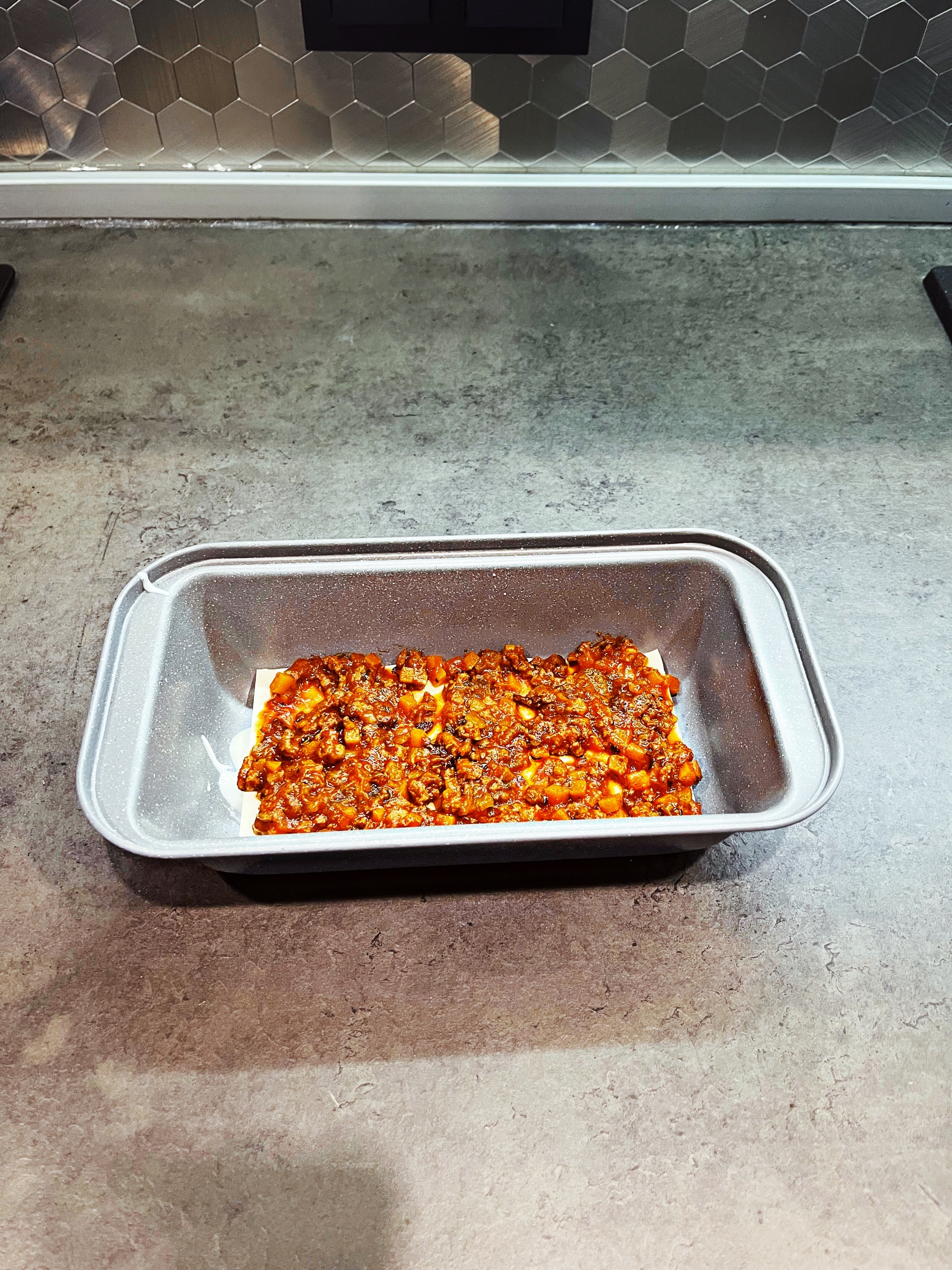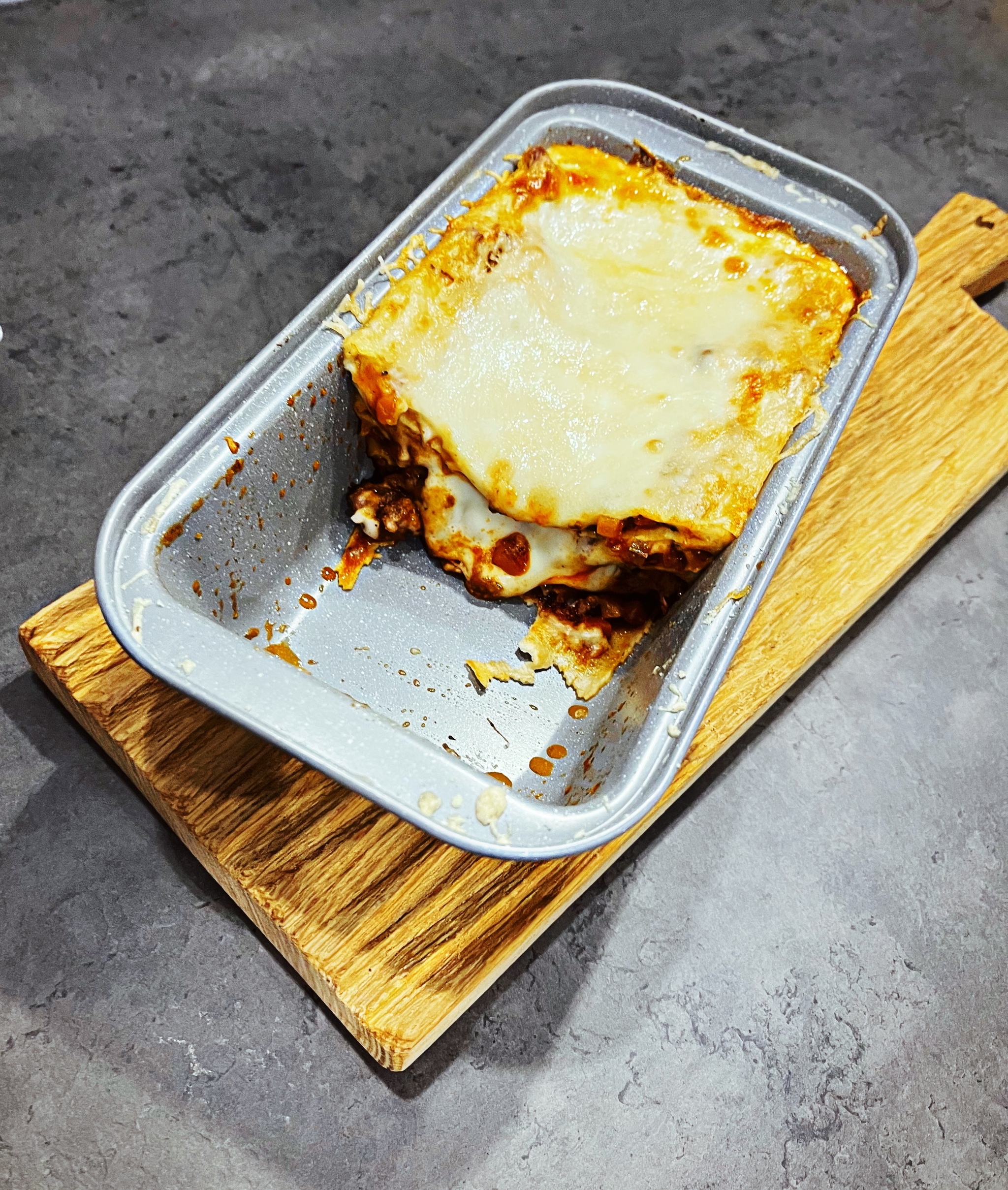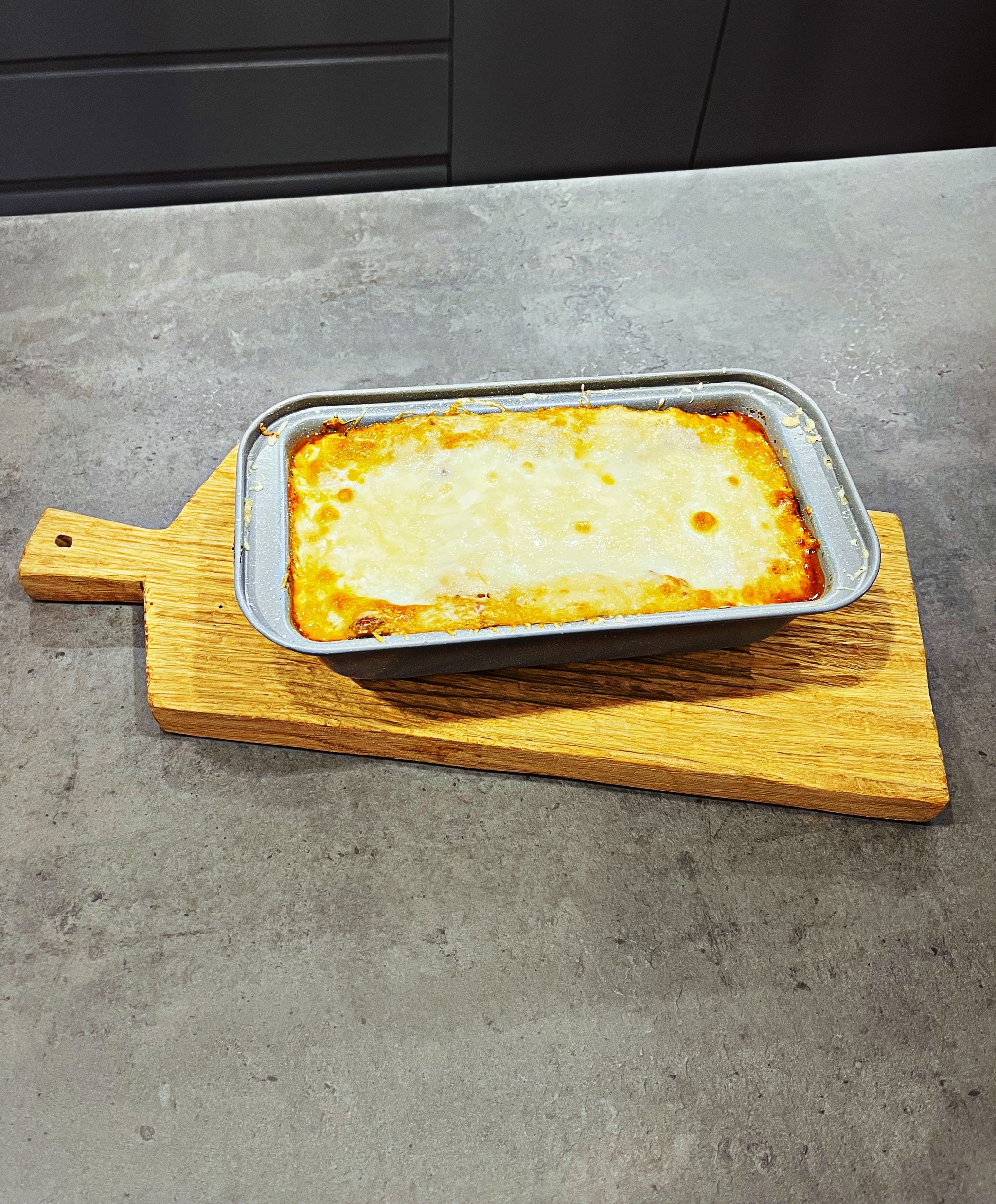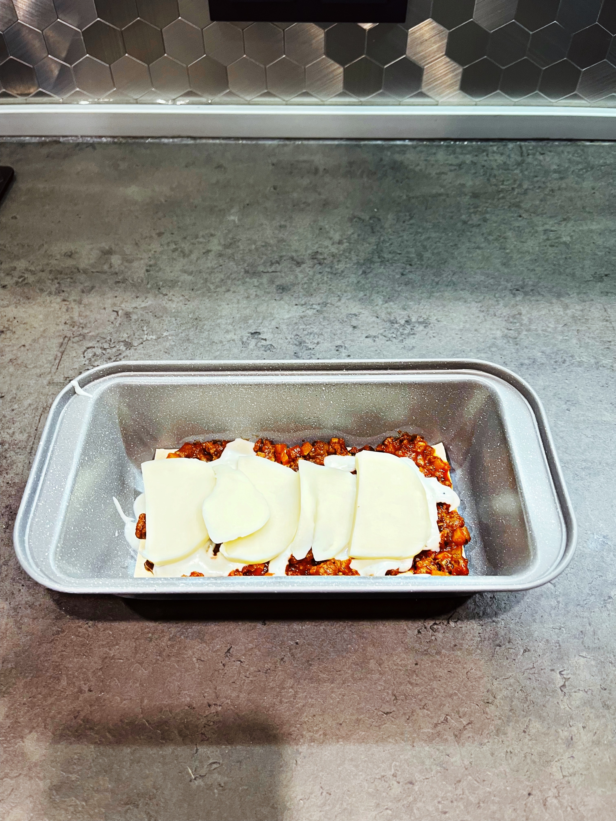 Далее дело за малым. Берём ёмкость в которой будем выпекать и собираем. Бешамель-лист-болоньезе-бешамель-моцарелла- лист. И продолжаем пока не закончится место.