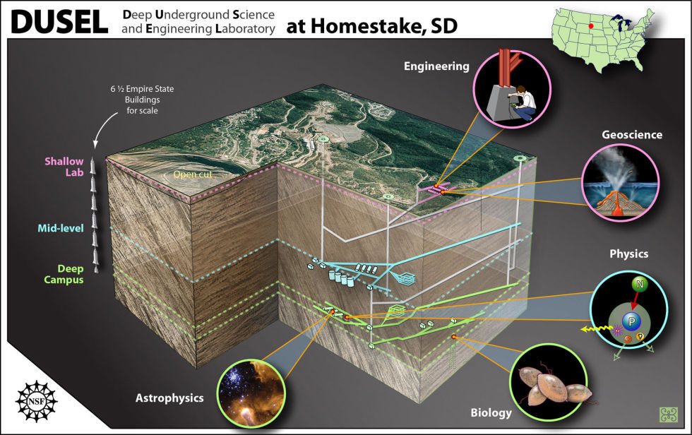 Бывшая шахта по добыче золота Homestake, самая крупная и глубокая (примерно 1,5 км) золотая шахта на континенте, перешла под руководство Sanford Underground Research Facility, или просто Sanford Lab — научному учреждению, превратившему штольни в лаборатории. Уникальные условия подземелий позволяют ученым проводить опыты с темной материей и нейтрино в изоляции от воздействий космической радиации и прочих атмосферных факторов.