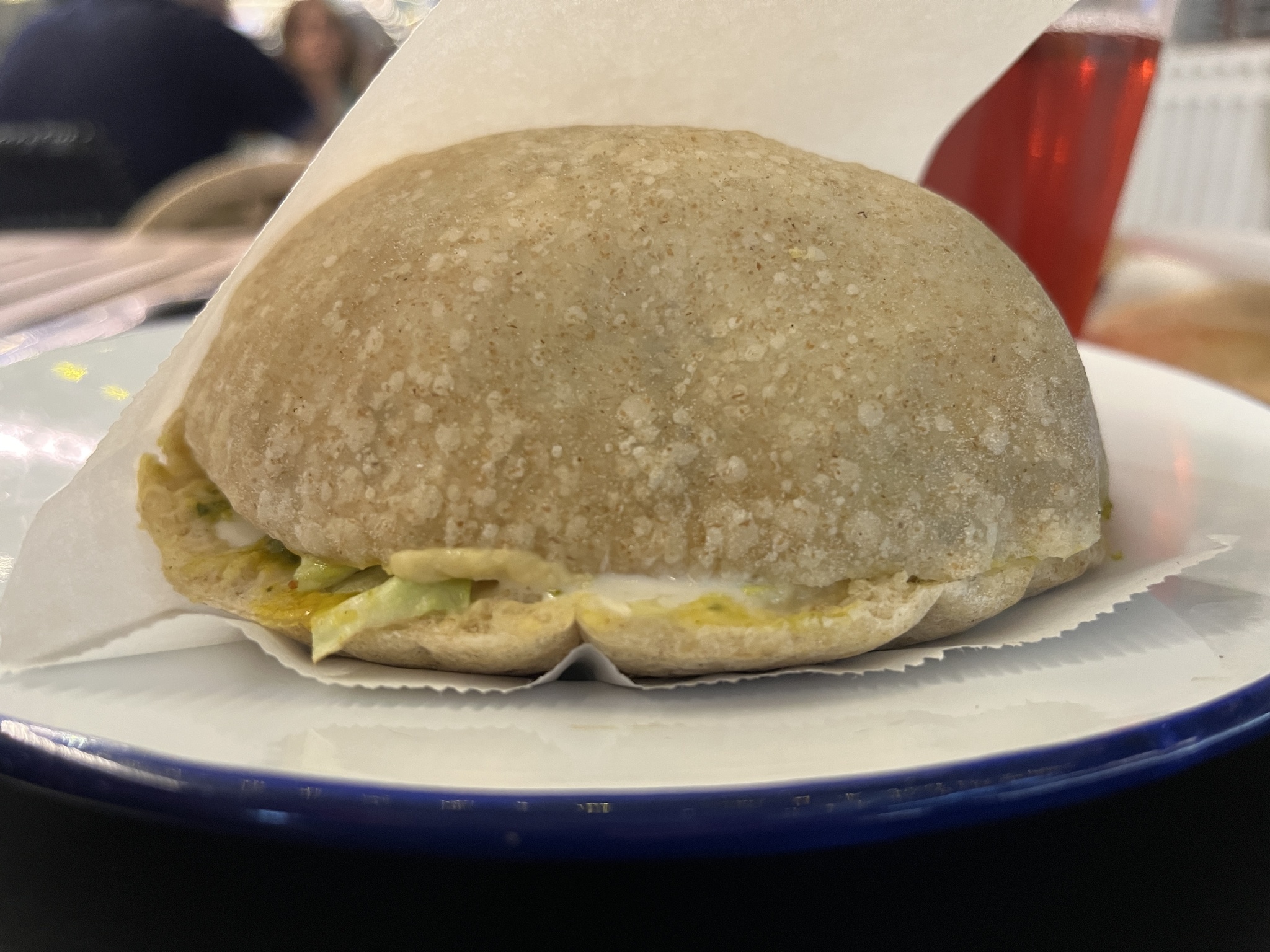 Шаварма великолепна. Внутри питы – четыре шарика фалафеля, хумус, салат Исраэли, Айсберг, солёные огурцы и три соуса: амба, тахини и схуг. Всё играет, ингредиенты дополняют друг друга и создают вполне сочную палитру, что не всегда удаётся добиться с использованием фалафеля. Здесь отлично.