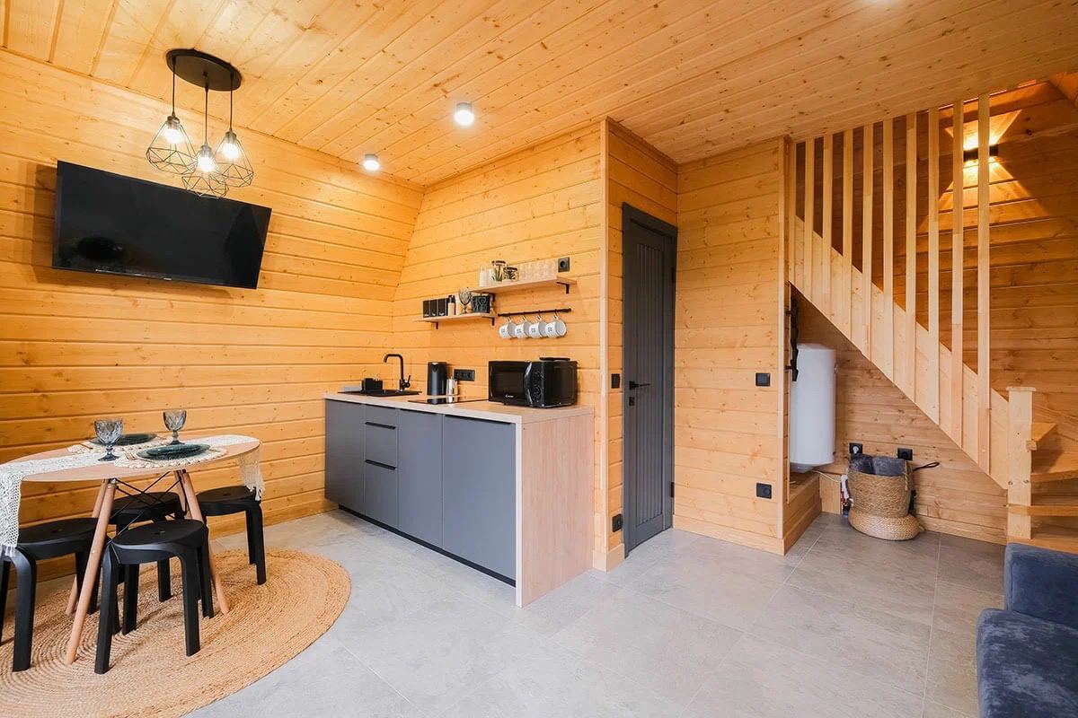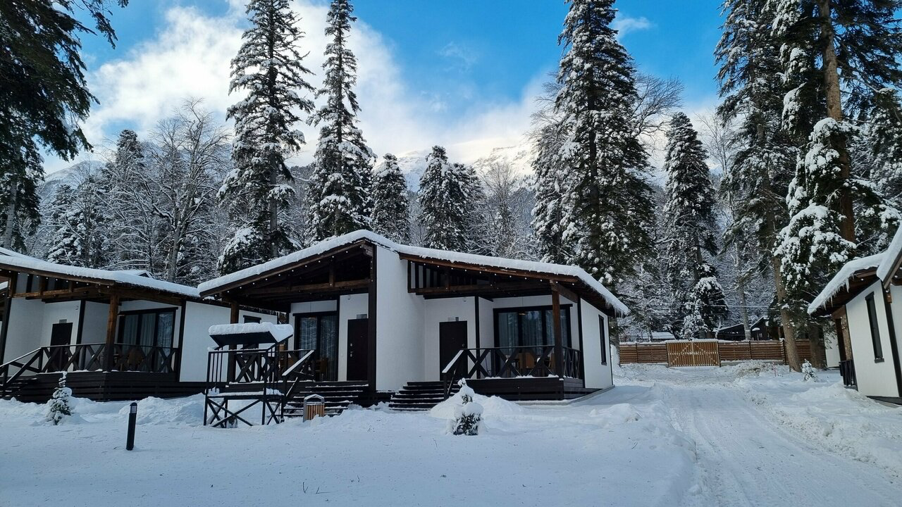 В двухэтажных деревянных коттеджах все обустроено для комфортного отдыха с семьей или компанией друзей. На территории базы есть площадки для барбекю, беседки с мангалом и баня. Рядом — спуск к реке и канатная дорога, где можно насладиться потрясающими видами. Отсюда легко добраться до плато Лаго-Наки и покататься на горных лыжах или даже искупаться в термальных источниках.