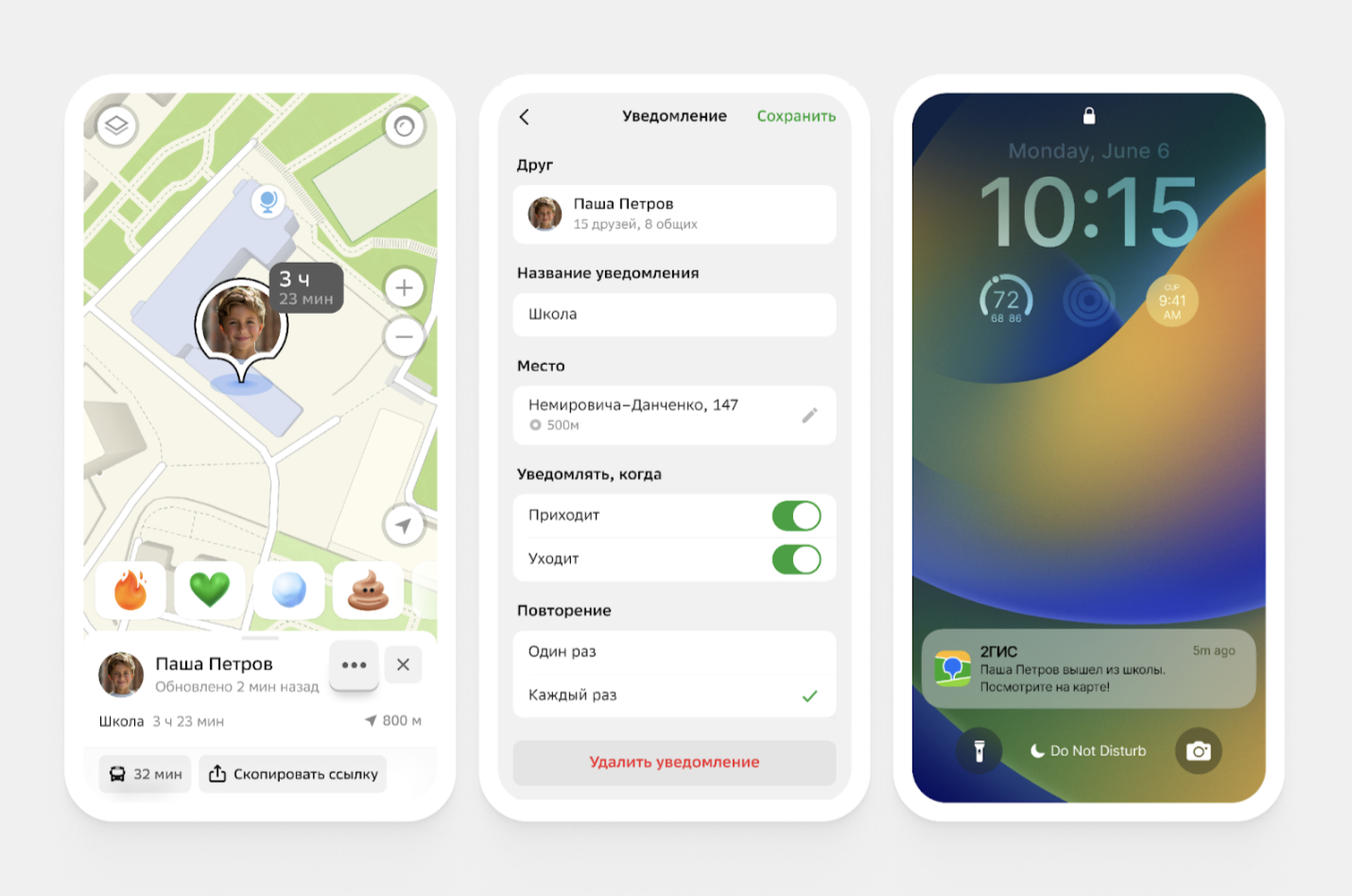 Функция геофенсинга в «Друзьях на карте» поможет быть в курсе перемещений близких. Просто задайте нужные зоны и настройте уведомления. Заботьтесь и будьте рядом вместе с 2ГИС!