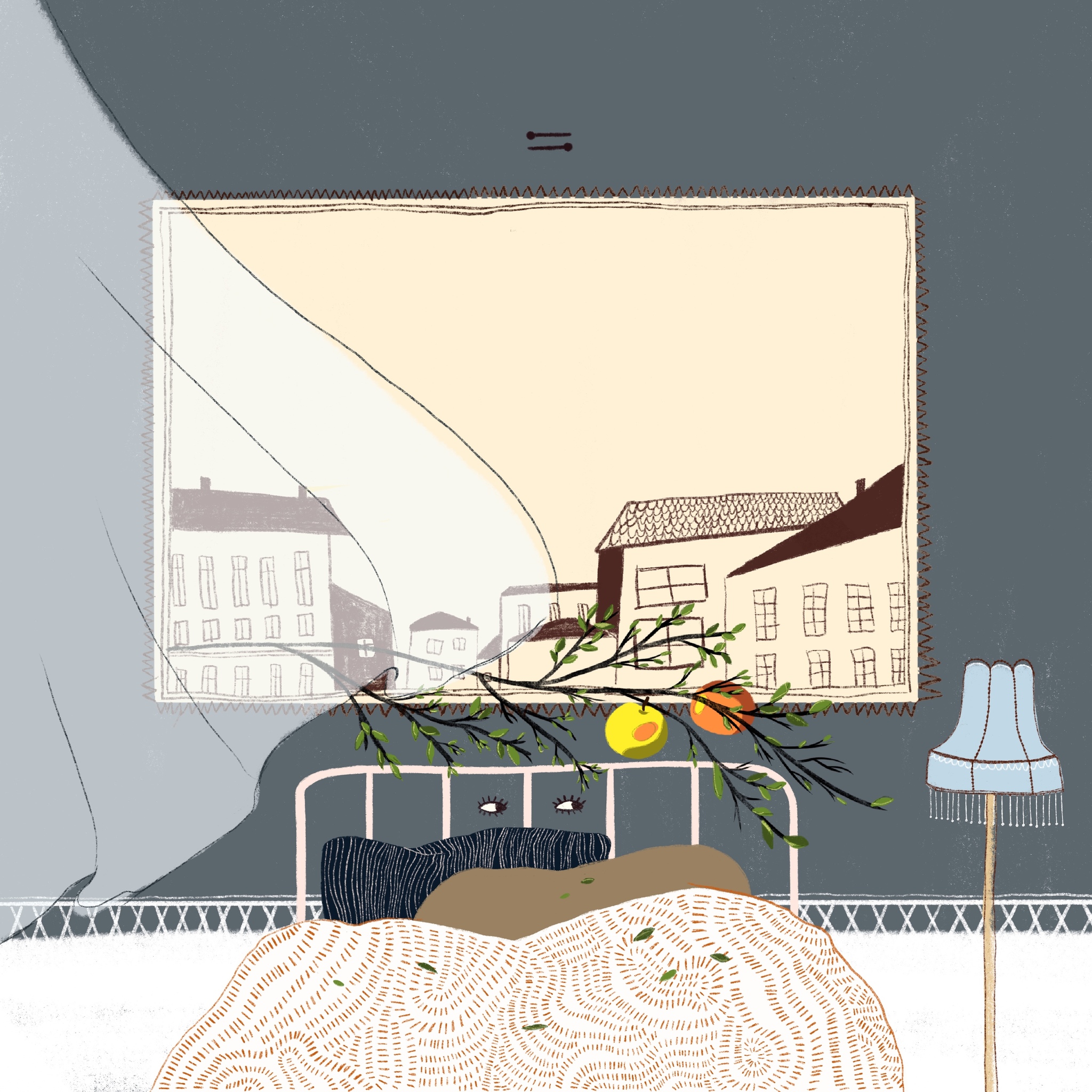 Он повел нас по лестнице на второй этаж. В самую дальнюю дверь. За ней оказалась небольшая комнатка с одной кроватью, столом, напольной лампой и окном, за которым росла старая кривая яблоня.
