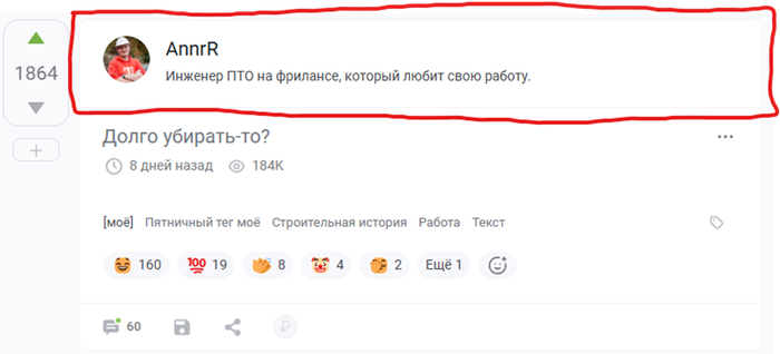 Я, например, примерно 13 лет назад начал писать строительные истории и кому-то зашло, понравилось. Кто-то рисовал комиксы, был Обломов, который выкладывал рецепты и фотки как он готовит, были текстовые авторы.