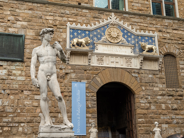 Если подражание — самая искренняя форма лести, то Микеланджело, несомненно, должен был бы покраснеть от смущения: его величественная статуя Давида была воспроизведена бесчисленное количество раз — от фотографий в роскошных альбомах по искусству до миниатюрных копий всех мыслимых форм и цветов, даже на кухонных фартуках. Но среди всех этих безделушек особенно выделяются 30 копий Давида в натуральную величину, разбросанные по всему миру. Наиболее известные из них находятся во Флоренции. Первая возвышается на площади Синьории перед Палаццо Веккьо, где когда-то стояла оригинальная статуя Давида; вторая гордо стоит на площади Микеланджело и отлита из бронзы.