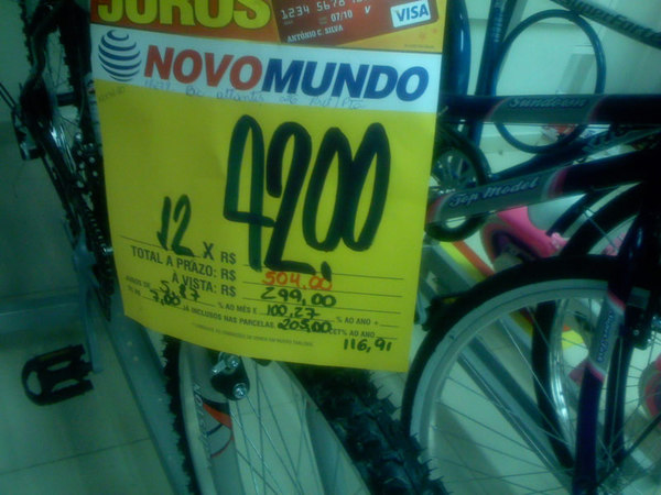 6) В Бразилии любые вещи можно купить в кредит: электронику, бытовые вещи и даже одежду. Когда вы заходите в магазин, то на всех ценниках будет цена за товар, а потом цена в месяц, если вы будете брать в кредит. Честно, никогда не фоткала ценники, вот нашла в инете одну фотку с "афигенным" фотошопом. Просто, чтобы вы понимали, что я имею в виду. В глаза сразу бросается маленькая сумма, а если подойдти поближе, можно увидеть, что эту сумму нужно умножить, например, на 8 и узнаете реальную цену. Порой рассрочка получается ужасно дорогая. Велосипед стоимостью в 300 реалов в рассрочке будет стоить 500.