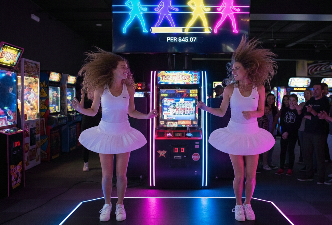 Зал игровых автоматов встретил их какофонией звуков: звоном монет, электронным писком и неоновым светом. В самом центре возвышалась платформа с огромным ярким экраном, на котором танцевали неоновые человечки под ритмичный бит.