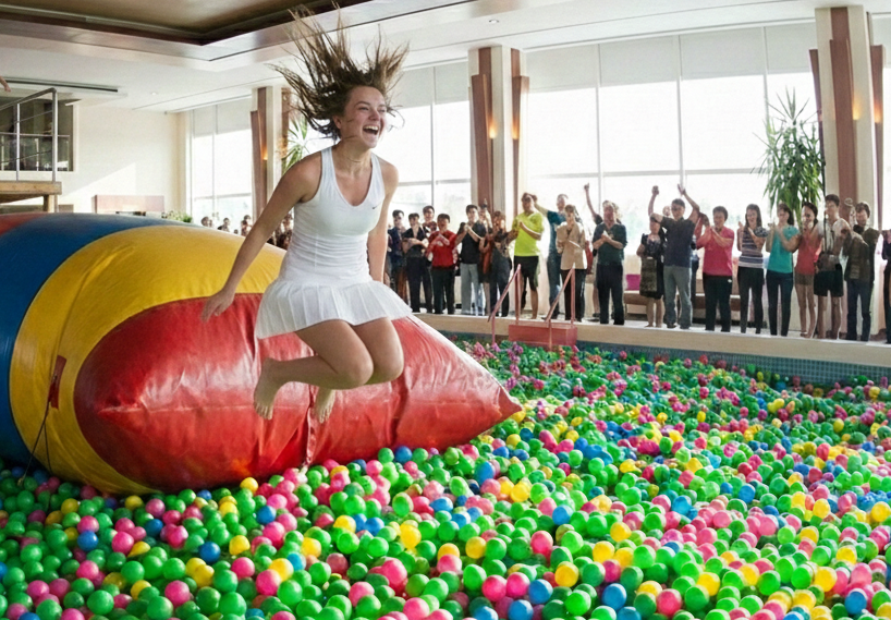 Первым делом их внимание привлек гигантский бассейн, до краев наполненный тысячами разноцветных пластиковых шариков. Но главным аттракционом здесь был «блоб» — огромная надувная подушка-катапульта. Правила были просты: один садится на край, а другие прыгают на противоположный конец с вышки, отправляя смельчака в полет.