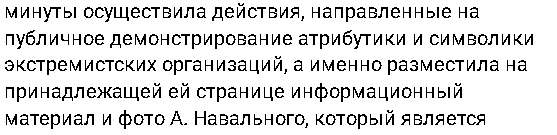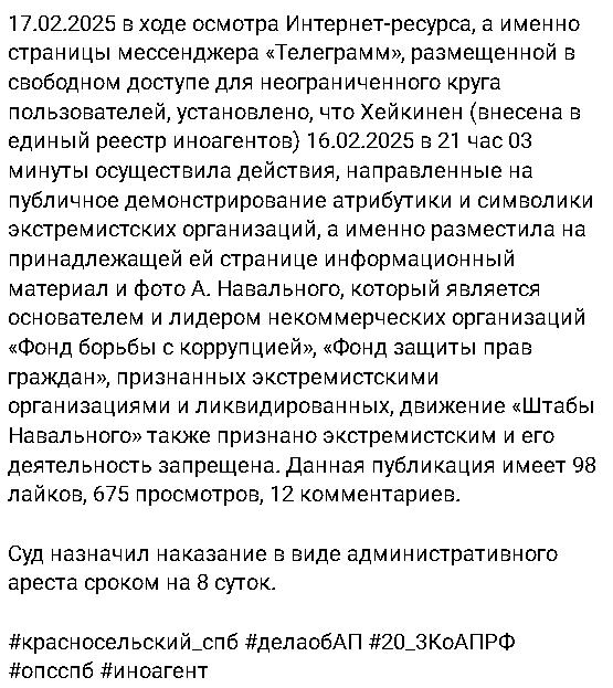 По версии суда, вечером 16 февраля 2025 года Хейкинен (внесена в реестр иноагентов) публично продемонстрировала атрибутики и символики экстремистских организаций, разместив на принадлежащем ей канале в Telegram фото оппозиционера Алексея Навального (включен в перечень террористов и экстремистов). Данная публикация собрала 98 лайков и 675 просмотров. Это действие попадает под действие административной статьи 20.3 КоАП РФ.