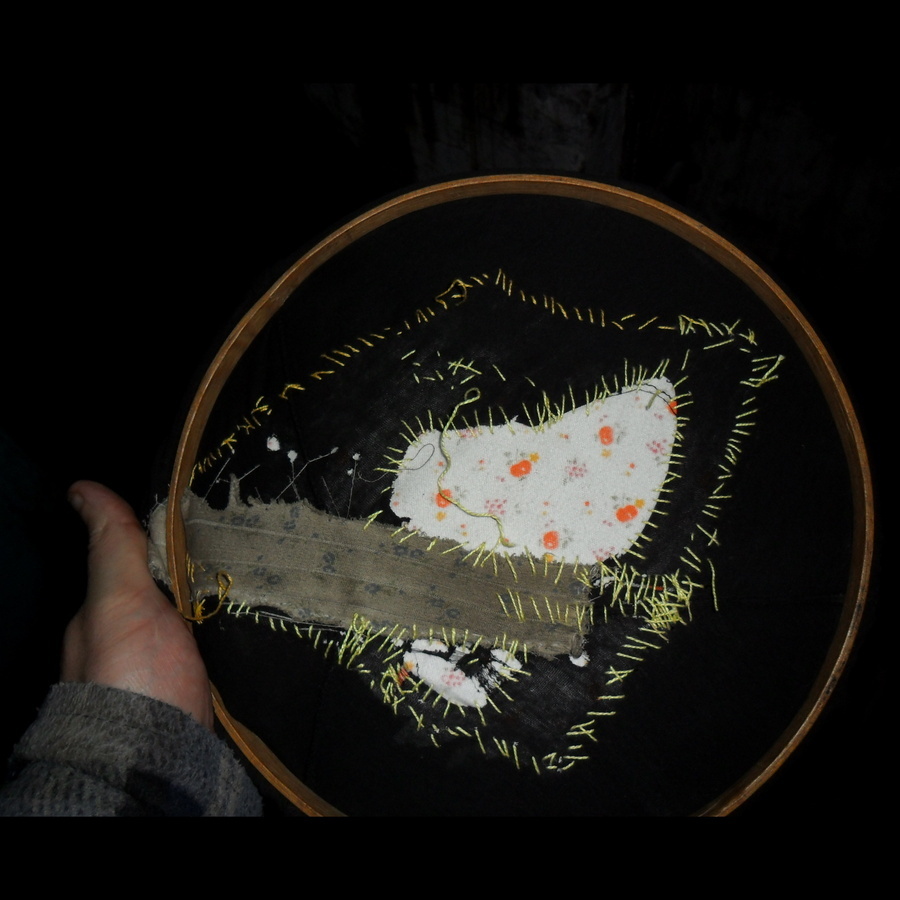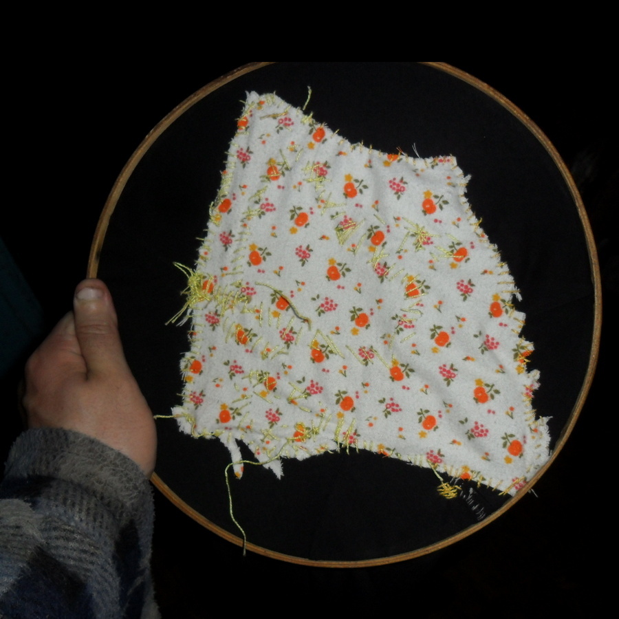 Трико разошлось в паху. Не знаю, как обручи называются. Зажал в них трико, приложил тряпочку и два часа шил. Второй раз шью, первый раз дырочка была маленькая, но полотно трико уже расползается как старая шинель Акакия Акакиевича, не к чему заплату пришить. Ткань, что на заплату пустил мягкая плотная, но с краев расползается по ниткам. Вдобавок мои ножницы ткань не режут, а жуют поэтому заплата вышла не ровная.