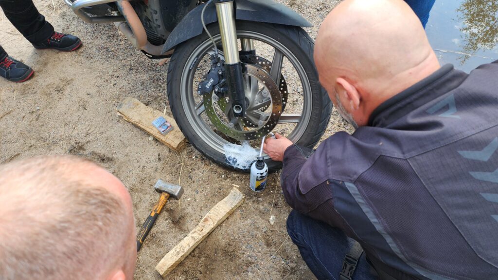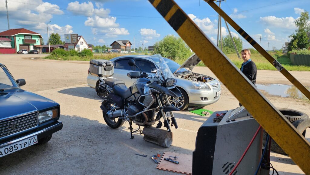 Следующие полчаса мы пытались вызвонить ближайшие шиномонтажи, эвакуаторы, хоть кого-то. Если в Москве вы моментально найдёте пяток способов связи с распоследней палаткой, про шиномонтажи Калязина можно только сказать, что они существуют. Ни графиков работы, ни телефонов. Телефонная эстафета заключалась в том что найденный номер говорил что не занимется мотоколёсами / не может эвакуировать, но сейчас даст другой номер. Знатно поработав колл-центром и кормом для комаров, мы увидели возвращающегося ведущего группы. Он довёл их до Калязина, не досчитался мотоциклов и поехал искать. У ремонтирующихся неподалёку фур был одолжен молоток и деревяшка, а обод довели до состояния медленного спускания... через трещину в основании спицы. Не знаю, от удара она появилась или от такого ремонта. Мой насос пригодился, но проблему до конца не решили.