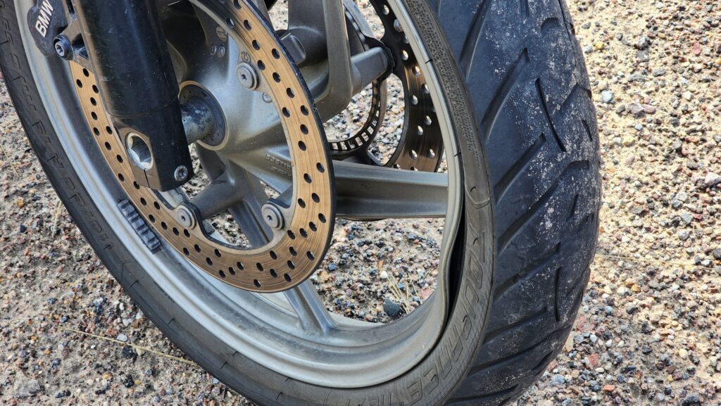 Впрочем, и до следующей заправки добрались далеко не сразу. На фото - BMW R1200GS, переднее колесо. Слава богу, не мой. Это Тверская область и если кто не в курсе, дороги там местами.. классные. Всего лишь одна пропущенная знатная яма. Владелец увидел падающее давление и срулил на обочину. Помимо него остановился я и владелец Harley Davidson Road King. А остальная группа опять уехала! То есть чтоб вы понимали, гусь немаленький мотоцикл, у меня у единственного в группе два жёлтых фонаря допсвета.. ну сложно так-то не заметить в зеркале что они пропали. Я не понимаю, правда.