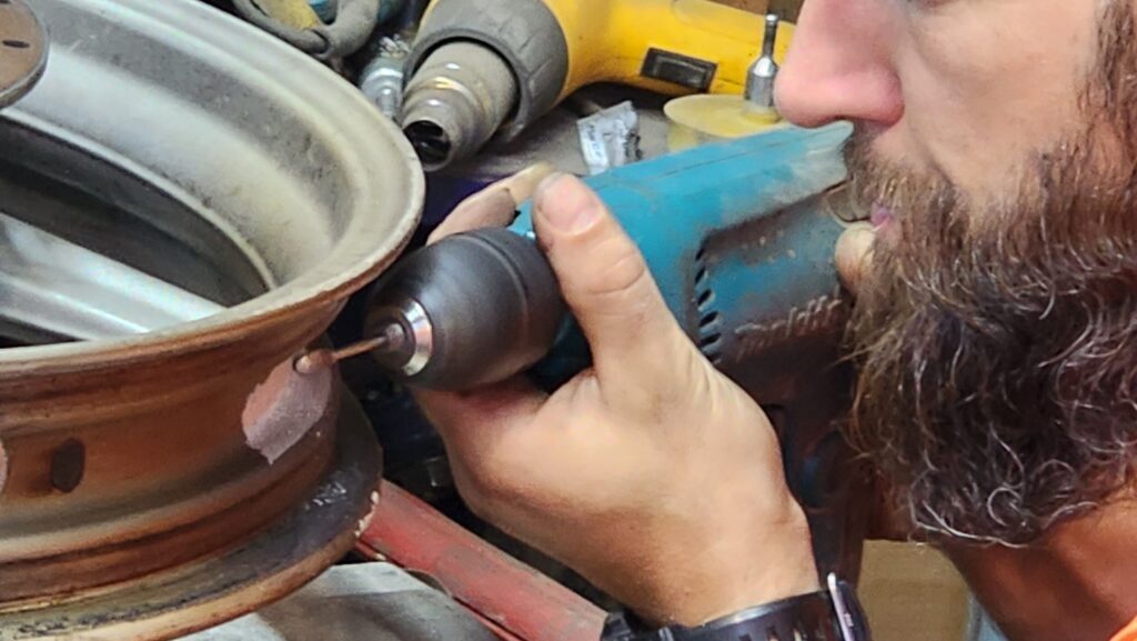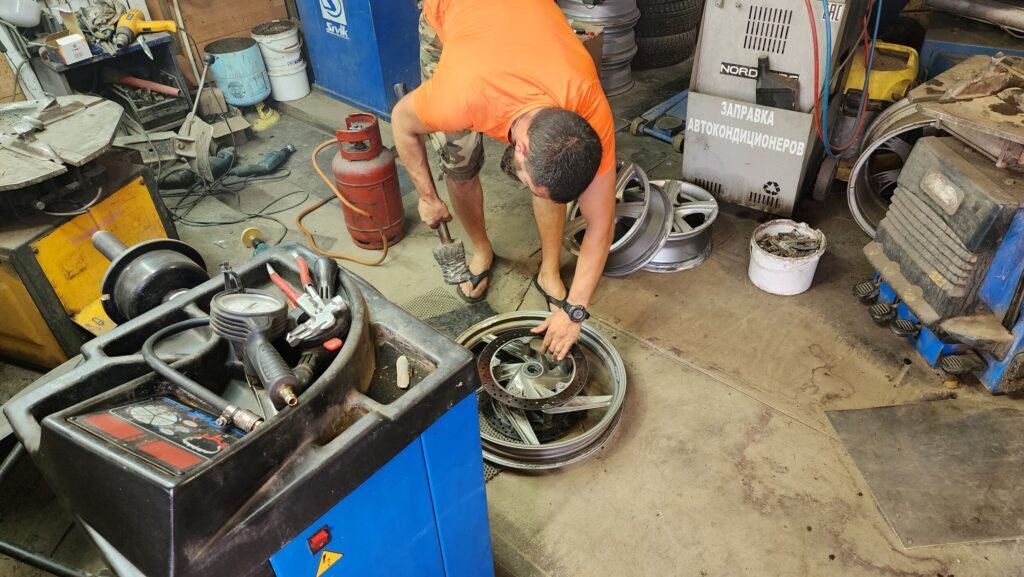 Дальше специально обученной кувалдой колесо приводится в более-менее круглую форму. Конечно, его потом всё равно надо будет прокатать, но в мастерской таких возможностей не было, как и времени у нашего спасителя.