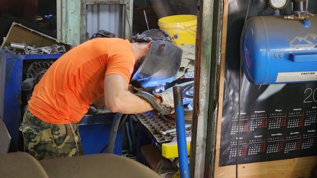 Попытка воспользоваться баллоном для экспресс-ремонта не увенчалась успехом, но давления хватило, чтобы дотянуть до Калязина. Местный шиномонтажник отговорил ребят от идеи залепить дыру холодной сваркой и вызвал нам сварщика. Сварщик взялся выполнить быстрый ремонт, процесс которого я запечатлел. Док купил всем по мороженке и ребята укатили, а я остался, не бросать же гусевода одного. Сам ремонт выглядит так: