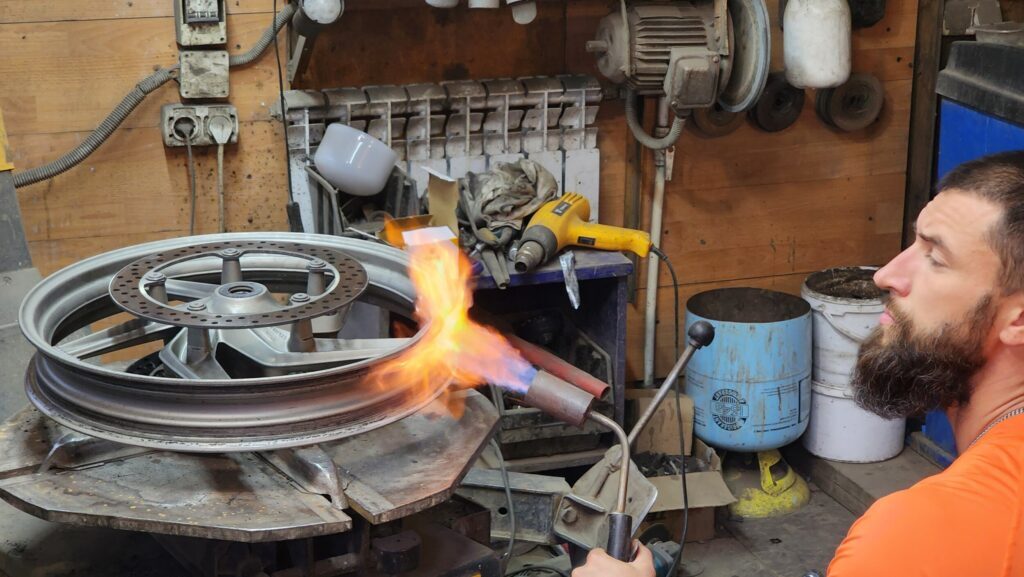 Сперва колесо хорошенько прогревается. Краске конец, но тут уж ничего не поделаешь.