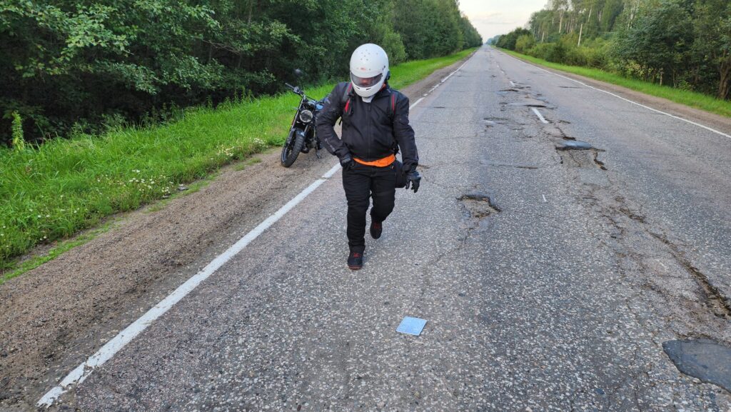 Это встречное направление. Улетел бы в траву - не нашли бы вообще. Сломало саму пластиковую рамку, у этого мотоцикла номер крепится на крыло, а крыло на маятнике, то есть его трясло всеми этими ямами. Кстати, на фото - участок с хорошим покрытием. Собираем номер и рамку, выезжаем в сторону заправки.. и через десяток минут я даю по тормозам потому что от Харлея отделяется что-то тёмное и летит во встречную канаву!