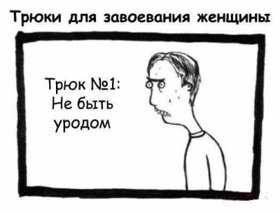 Это, конечно, неплохие советы в общем, но давайте честно признаемся себе — девок нам хочется вот прямо сейчас, в худшем случае — в течении недели, а не через 1-2 года, когда мы накачаемся, поумнеем, заработаем (нужное подчеркнуть). А может мы и не хотим качаться? Зарабатывать? Может мы на херу вертели упорный труд? Может нам и в танчики хорошо, на старом компе, который собрали на коленке, попивая сгущёнку? Кто сказал, что нам в таком случае, бабы не положено? Гоните его, насмехайтесь над ним. Это чудовищная ложь.