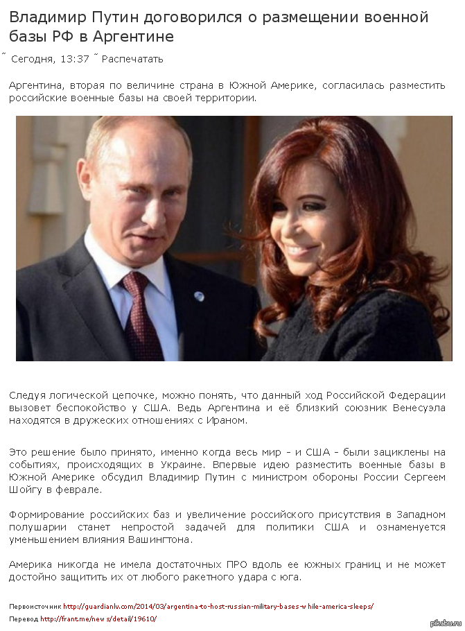 2064 patriot21 11 лет назад Вот это поворот. В пентагоне, наверное, сейчас у всех пуканы рвутся. Владимир Путин Россия США Аргентина