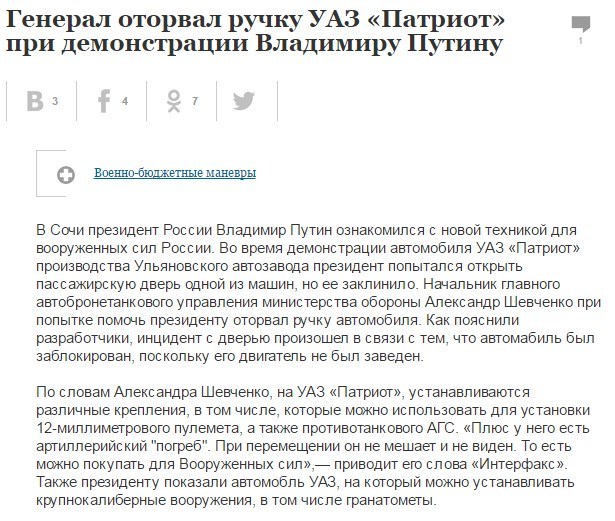 mrakobes15 Генерал оторвал ручку УАЗ «Патриот» при демонстрации Владимиру Путину. 9 лет назад http://www.kommersant.ru/doc/2984441 УАЗ Сочи Новости Происшествие Владимир Путин Авто