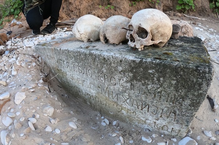 Самарская область, Шигонский район, нашли старое заброшенное кладбище, захоронения идут от 1800 года, их много лет размывает река Волга, в итоге все останки просто осыпаются в воду и лежат по всему пляжу. Фото мои, тег "моё"