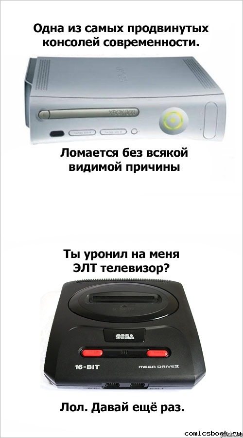 Ну, если говорить честно, то: 1) В сеге просто ломаться нечему, там 1 плата, в которую вшито всё. Только разломав её пополам можно её сломать. 2) Я могу позволить себе иксбокс, но не делаю этого по многим причинам, так как: консольки тормозят развитие игровой индустрии. Не было бы "современных консолей" - уже давно бы играли в полном 3д в стереошлемах. Поясню. Компы спокойно апгредятся, а консоли нет. Консоль выпущена и всё, пока не будет новой консоли - не будет ничего нового в графике, геймплее. Ну а почему же консоли мешают-то улучшению графики на компах? Ответ: разработчикам не выгодно делать очень разные версии игр на консоль и на ПК, тем более, что игры на консоли всегда стоят дороже, чем на ПК и затачиваются, собственно, под консоль, что бы срубить бабла, а на пк так, довеском идут. Раньше, до выхода норм. ПК консольки типа денди, сеги, ПС1 были выгодны для развития игровой индустрии, но сейчас - досадная помеха. Поэтому многие, включая меня, и ржут\издеваются над современными консолями.