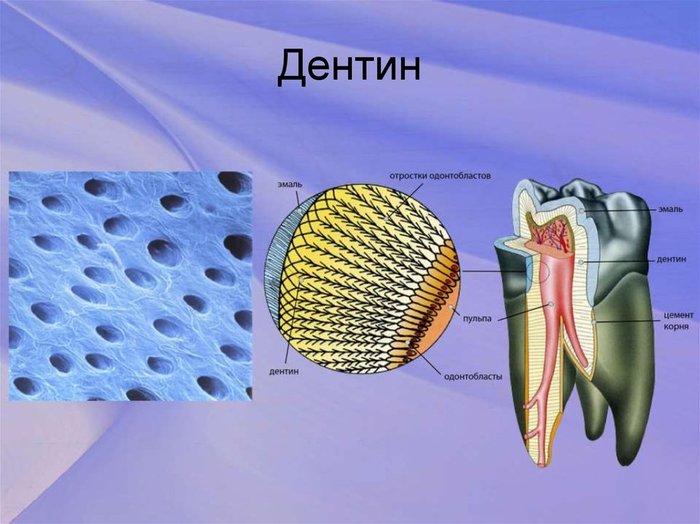Дентин имеет пористую структуру, состоит из микротрубочек. Внутри зуба имеется система полостей – пульповая камера и корневые каналы, в которой содержится пульпа. В пульпе имеются клетки, которые могут образовывать дентин. Поэтому он может регенерировать, но только в пределах пульповой камеры (в толщу твёрдых тканей зуба клетки проникнуть не могут – они не способны мигрировать).