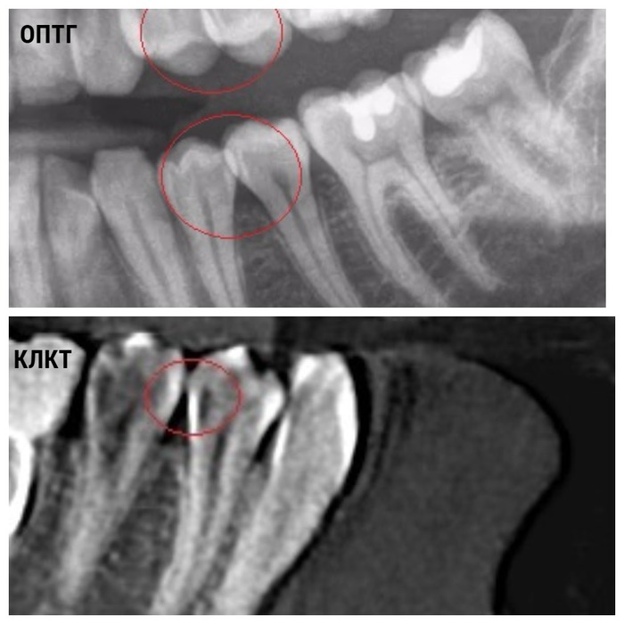 Например, панорамный снимок (ортопантомограмма, ОПТГ) за счёт наложений даёт около 50% информации о зубочелюстной системе. А компьютерная томограмма (КТ, КЛКТ) - от 80% до 95%. Скрытый кариес в начальных стадиях виден только на КТ. Кружками отмечена зона наложения на ОПТГ и эта же зона на КЛКТ без наложений. Тёмное пятно на боковой стенке зуба - это кариозная полость.