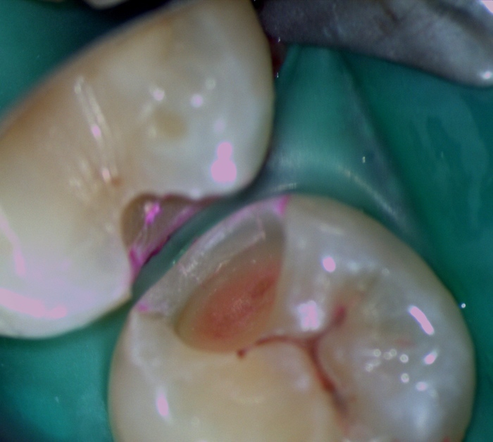 Для того, чтобы под новой пломбой не развивался кариес, нужно убрать все инфицированные ткани. При внешнем осмотре и по рентгеновскому снимку не всегда можно оценить реальный объём будущей полости. Для выявления поражённых кариесом тканей врачи используют специальный краситель – кариес-маркер. Он окрашивает только заражённый размягчённый дентин и эмаль, а твёрдые здоровые не трогает.