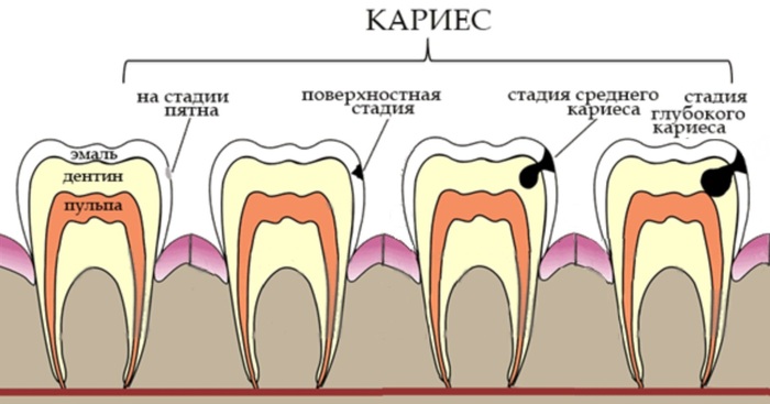 Кариес – это патологический процесс, который начинается с деминерализации твердых тканей зуба (эмали, а потом –дентина) с последующим образованием полости и дальнейшим её увеличением. У кариозного процесса есть несколько стадий.