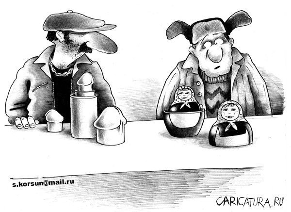 Два ресторана рядом. На входе стоят по два швейцара. "Генацвале" и "Гена с Валей". Папахи, бурки, кокошники и конечно- балалайка. Как-то так.