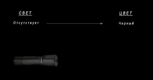 Посмотрите, в местах пересечения световых лучей друг с другом образовались новые световые лучи – новые цвета. Зеленый и красный образовали желтый, зеленый и синий – голубой, синий и красный — пурпурный. Таким образом, изменяя яркость световых лучей и комбинируя цвета можно получить большое многообразие цветовых тонов и оттенков цвета. Обратите внимание на центр пересечения зеленого, красного и синего цветов: в центре вы увидите белый цвет. Тот самый, о котором мы недавно говорили. Белый цвет – это сумма всех цветов. Он является «самым сильным цветом» из всех видимых нами цветов. Противоположный белому – черный цвет. Черный цвет – это полное отсутствие света вообще. То есть там, где нет света — там мрак, там всё становится черным. Пример тому — иллюстрация 4 (вторая картинка).
