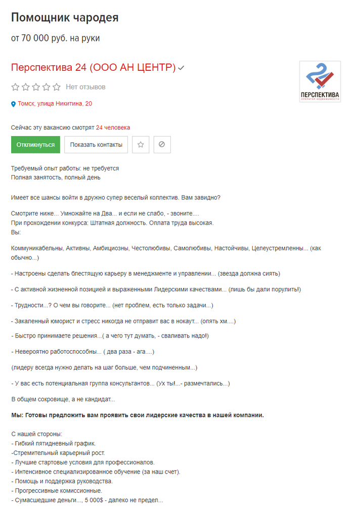 5 frabar А через пару лет и чародеем можно стать 4 года назад Вот такую забавную вакансию встретил на hh. Почитал, посмеялся, закрыл. Вакансии Юмор Риэлтор HH 1 Ещё 0