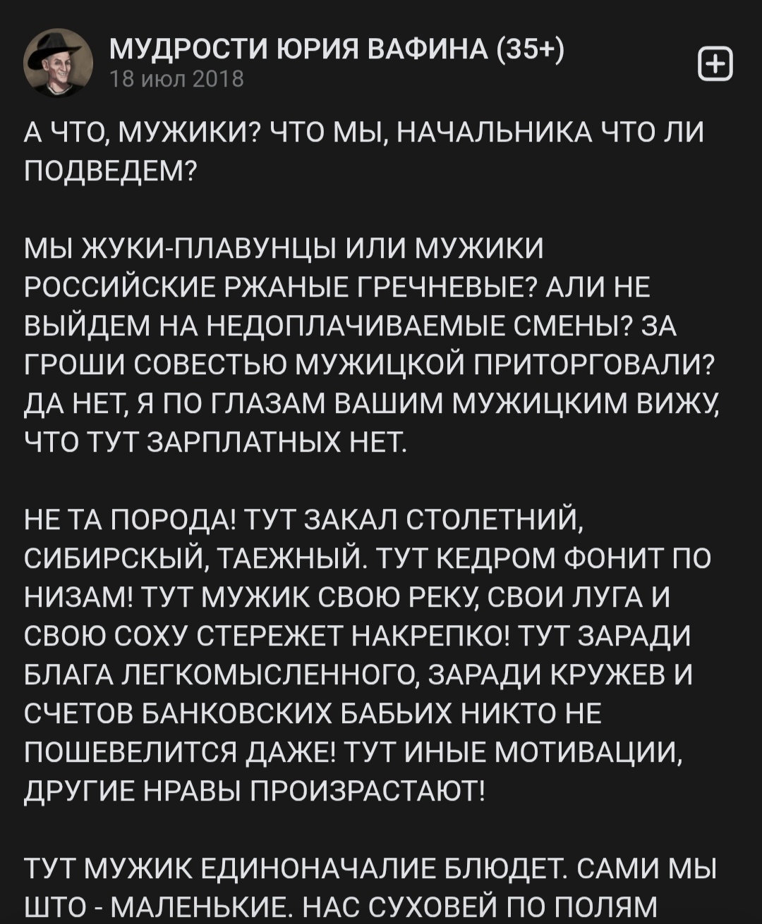Мы жуки-плавунцы или мужики российские ржаные гречневые? Али не выйдем на недоплачиваемые смены? За гроши совестью мужицкой приторговали? Да нет, я по глазам вашим мужицким вижу, что тут зарплатных нет.